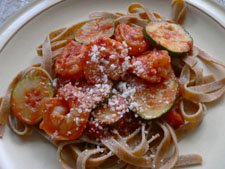 This shrimp and zucchini recipe has a little kick with the green chili's mixed into the chopped tomatoes. I served this over a bed of Tomato Basil flavored linguine.
