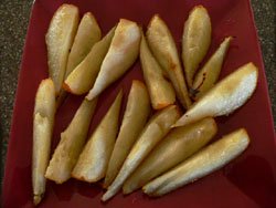 Preheat the oven to 400°F. Cut each pear half into 4 wedges and put on parchment-lined baking sheet. Mix together butter, sugar and lemon juice and drizzle over pears. Roast the pears for 20 to 30 minutes, stirring every 10 minutes. Allow the pears to cool to room temperature.