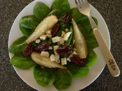 Roasted Pear Spinach Salad on a bed of baby spinach topped with delicious roasted pears, blue cheese, caramelized pecans and then drizzled with Dijon Vinaigrette salad dressing. Don't care for spinach? Substitute the spinach with spring mix salad or put together a blend of salad greens.